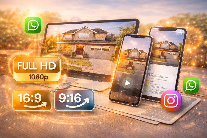 Smooth visual transitions that simulate a guided property viewing. Ideal for sharing on WhatsApp, Instagram and major social media platforms.