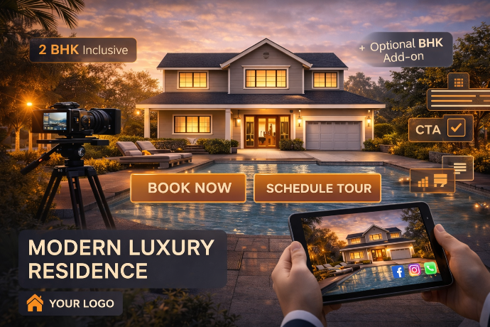 Showcases rooms, elevation, amenities, and USPs in a logical flow. Ensures buyers understand the value within seconds.